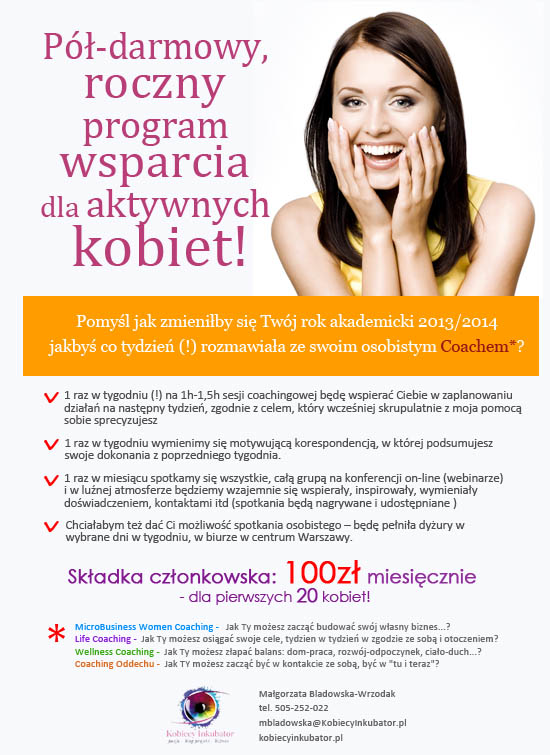 „Jestem po pierwszej sesji z Małgosią… WOW i jestem pod dużym wrażeniem, uświadomiłam sobie kilka rzeczy i zwróciłam uwagę na to, co wcześniej wydawało mi się nieważne. Małgosia jest bardzo dobrym coach’em, potrafi nakierować na odpowiedni tor. Świetnie prowadzi sesję. Jestem bardzo zadowolona i przede wszystkim zmotywowana do działania. Mogłabym powiedzieć W KOŃCU COŚ SIĘ DZIEJE, wiem, że dalej może być już tylko lepiej!” Iwona P.